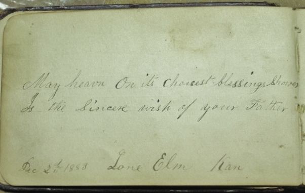Here's the inscription Ward's father wrote in Ward's autograph book on December 2, 1883 while they were living in Lone Elm.