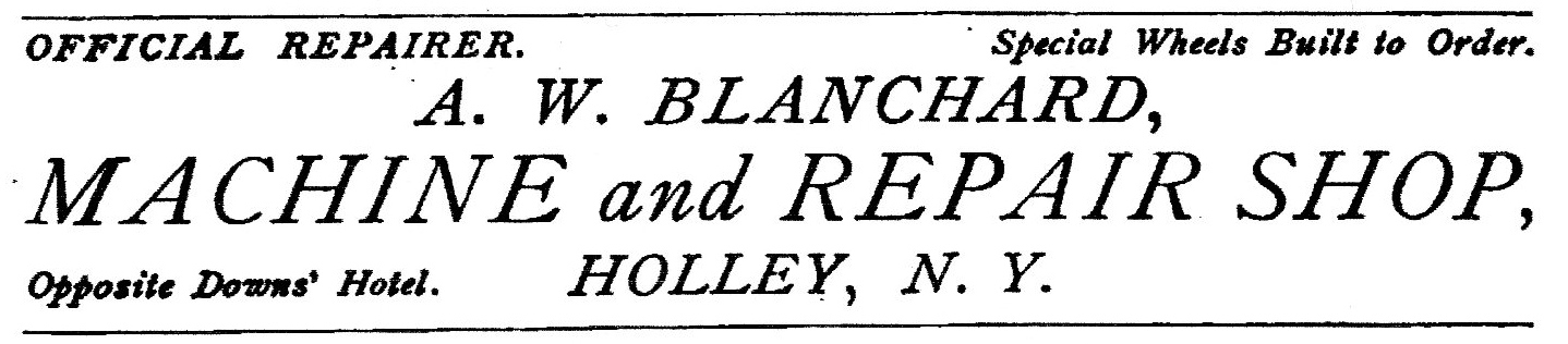 In early 1899 A.W. ran the following ad a couple of times in The Holley Standard: “Bicycles, Cycle Sundries, Electrical Supplies and Repairing. A.W. Blanchard, Thomas Street. Shop open from 10 a.m. to 1 p.m. and 2 to 5 p.m.”