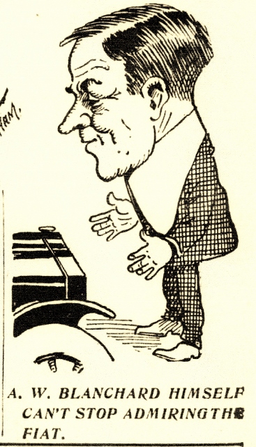 There was a second Brooklyn Automobile Show at the 23rd Regiment Armory the following year, from February 24th to March 2nd. A.W. showed Fiat and Case cars. Here's a caricature of him that appeared in the February 28th issue of the Brooklyn Daily Eagle.