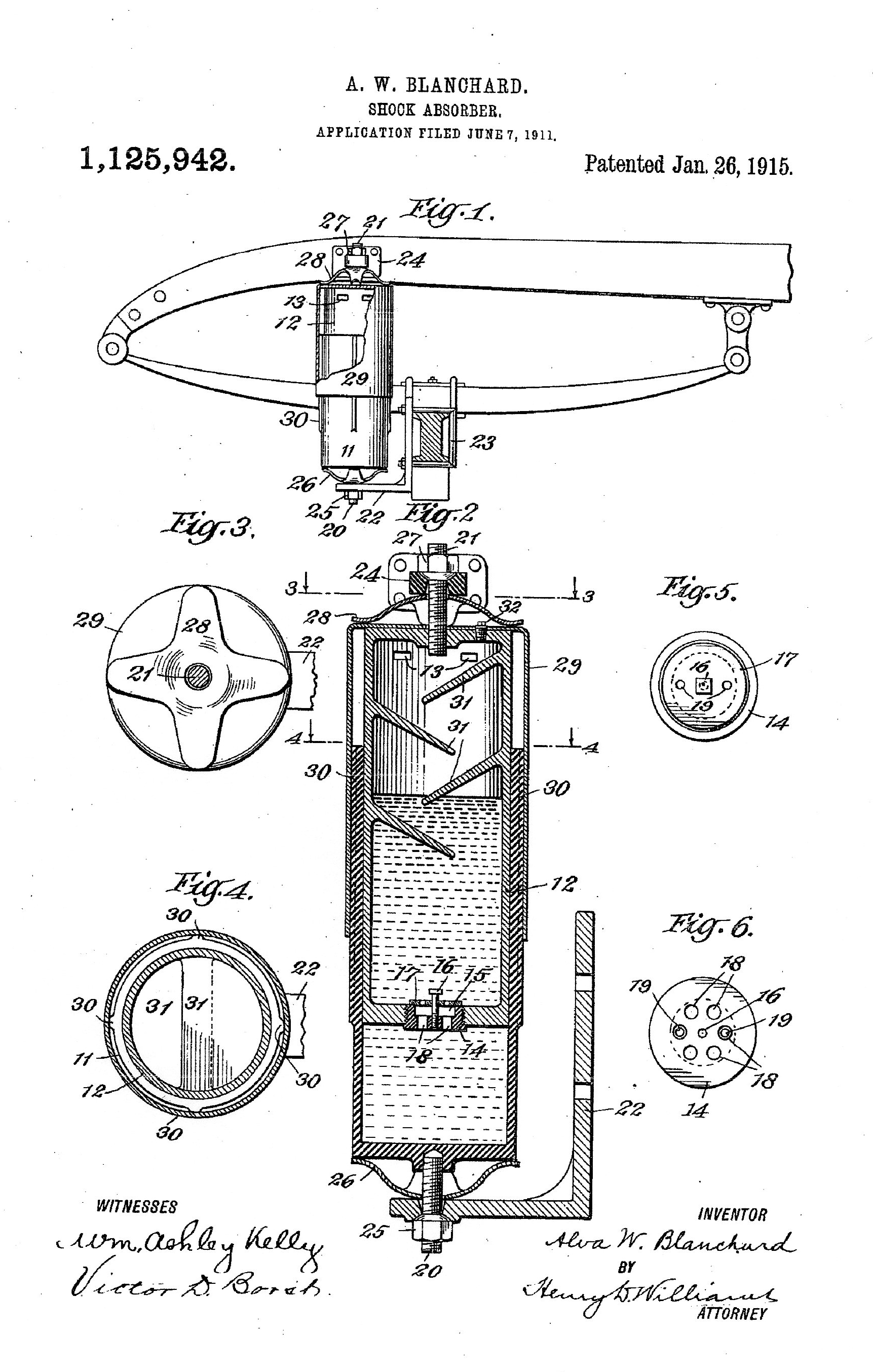 A.W. was awarded U.S. Patent No. 1,125,942 on January 26, 1915, for a type of hydraulic shock absorber for automobiles. He had applied for the patent way back on June 7, 1911. Here's the first page of this patent.