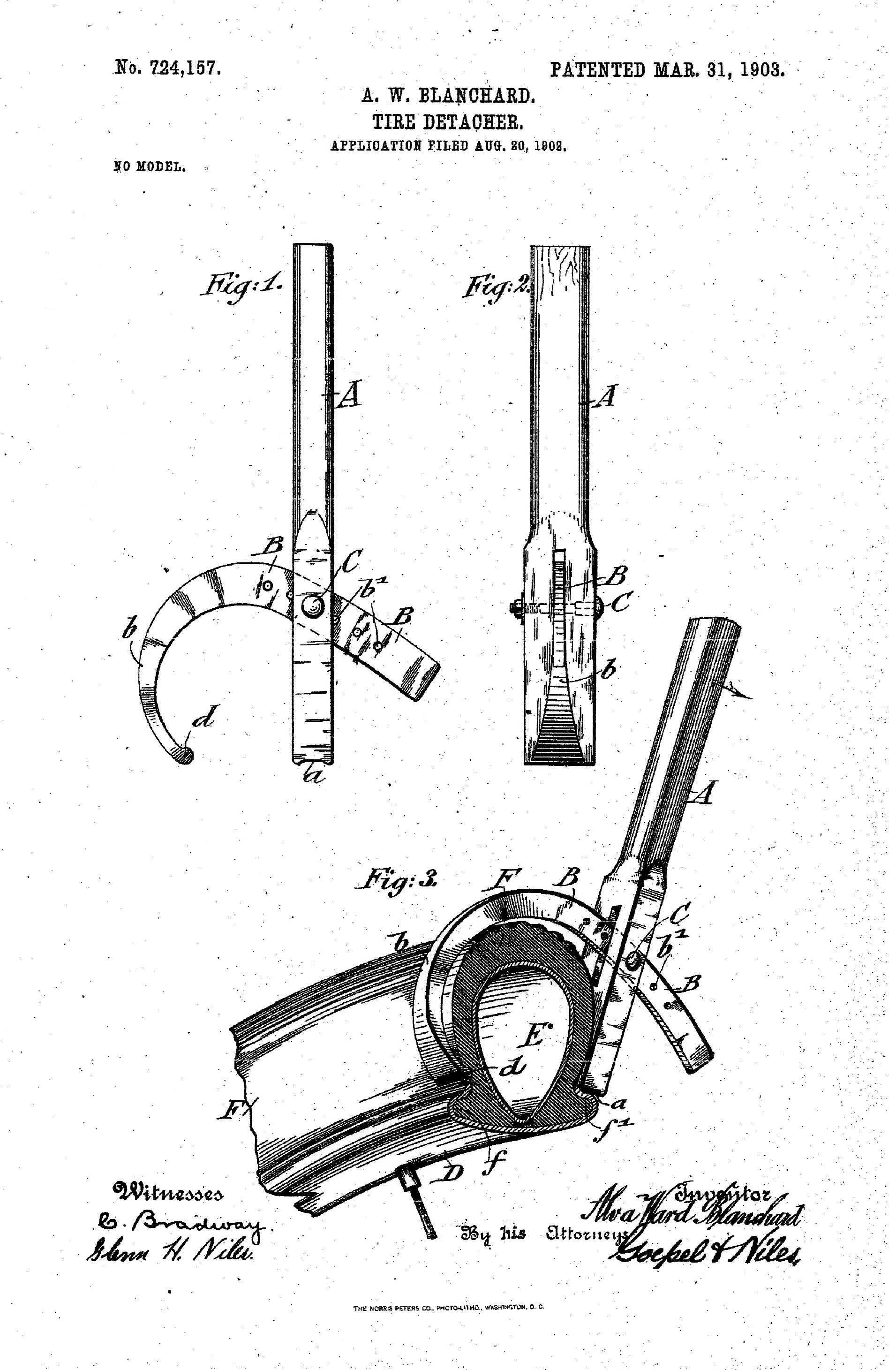 A.W. applied for and was granted U.S. Patent No. 724,157 on March 31, 1903, for a “Tire Detacher.” The device was made of hardwood and nickel-plated steel and was adjustable to all sizes of tires up to 4½ inches. A.W. claimed in a magazine ad that it was impossible to pinch the tube when this device was properly adjusted. It's interesting - almost comical - to note that in the 1903 city directory for Brooklyn A.W.'s occupation was listed as "tiredetacher!" (His home address in 1903 was 832 Washington Avenue.) Here's the first page of his tire detacher patent.