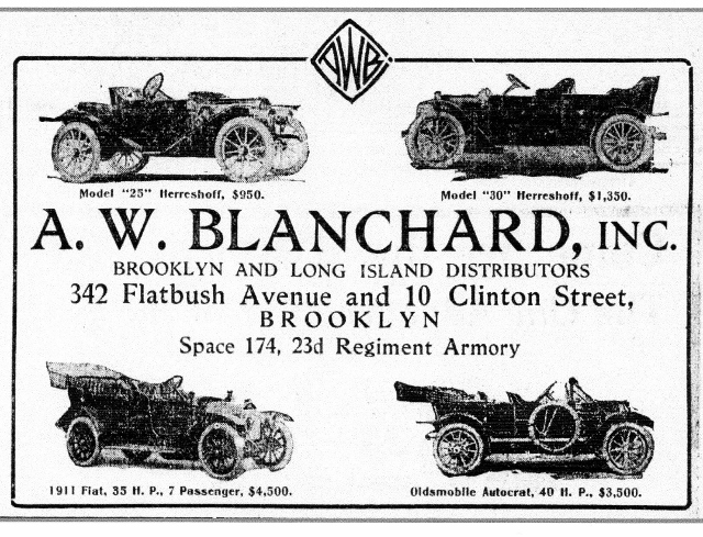 In March 1910 he started selling Fiats, and he advertised heavily for Fiats, Herreshoffs and Oldsmobiles in the Brooklyn Daily Eagle newspaper. Interestingly, he did not advertise the Fiats and Herreshoffs in the New York Times, but he ran quite a few ads in the Times from 1908 to 1912, and he was identified as an Oldsmobile dealer throughout 1910. He also advertised used cars in the Times.
