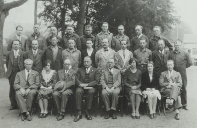 In this 1929 photo of Dutchess Auto employees, A.W. is seated on the far left. His daughter Biz and son Yorke are also in the photo. Biz is seated third from the right, and Yorke is standing right behind her, fourth from the right in that row.