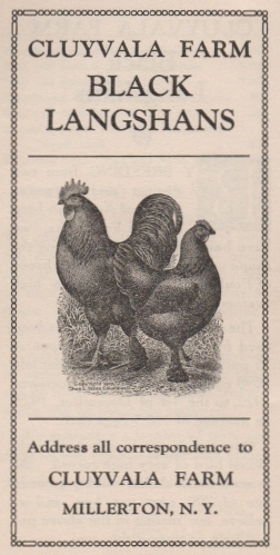 Now, if the saw mill and cider mill weren’t enough, it seems like A.W. was always trying to find other innovative ways to make a few bucks. In 1924 he had a brochure printed up advertising the fact that he was selling Black Langshan chickens and hatching eggs from Cluyvala Farm. (His father’s gift of the “sitting hen” back in 1896 must have paid off!) Sometime along in here A.W. also had stationery printed up for his business in Millerton as a landscape architect. Eacy recalled that her father knew a lot about landscape architecture. (He was really pleased when Eacy married a landscape architect!) A.W. had a big drawing board that he would do his landscaping and surveying work on. He worked in his office in a little room behind the fireplace at Cluyvala.