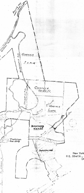 As mentioned earlier, much of the land A.W. owned spanned a hill between Cluyvala on Route 199 and the village of Millerton. The area near his farm A.W. called Cluyvala Farm. And the tract on the top of the hill -- with the best view -- he called Cluyvala Heights. On the east side of the hill was Cluyvala Slope, Blanchard Woods and then Borderland. The hard-to-read map on this real estate flier shows the extent of his property. The orientation of this map is a little misleading. North is to the right, about two o'clock.