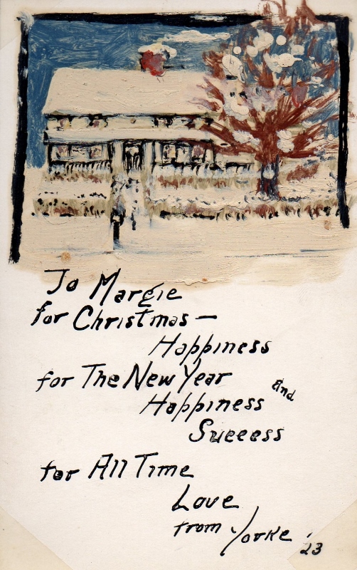 In 1923 Yorke hand-painted this Christmas card for Margie. It was a depiction of the Bard farm in Millerton. He painted a couple of others too.