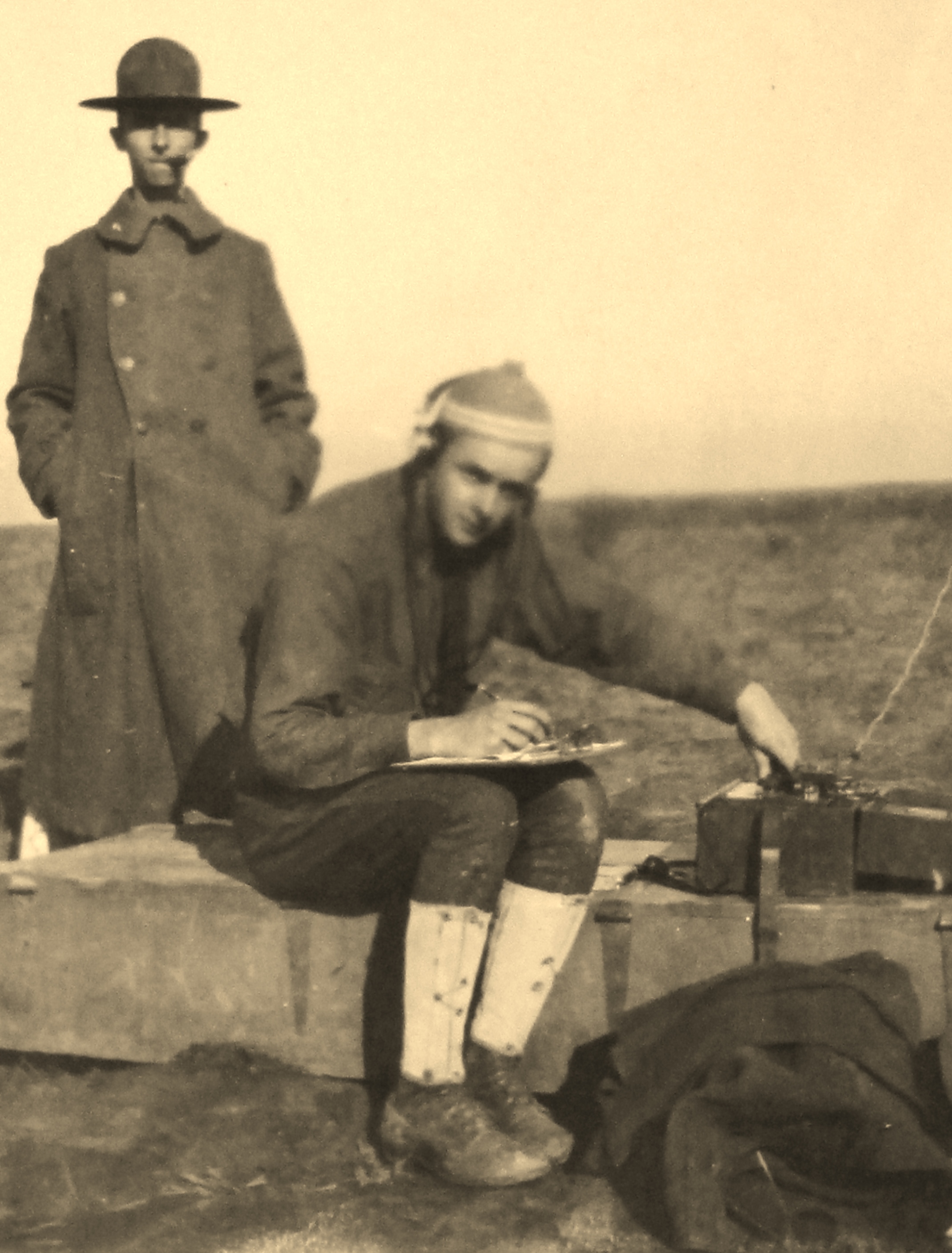 Meanwhile, Yorke’s existing military records show that on August 7, 1918, he was sent to something called S.R.O. in Austin, Texas. This was the Air Service School for Radio Operators that was set up at the University of Texas in Austin in the spring of 1918. According to a brief history of the Air Service School, "the aim of the school was to train men as quickly as possible in the science of maintaining, constructing and operating radio apparatus of the Air Service, including the wireless telephone." The following subjects were included in the students' curriculum: Elementary Electricity, Practical Radio Operation, Buzzer Practice, Artillery Co-operation, Direction Finding and Wireless Telephony. He's doing some radio stuff in the field in this photo, under the watchful eye of somebody. (By the way, Yorke's Army buddies called him "Blanch" while they were at this school.)