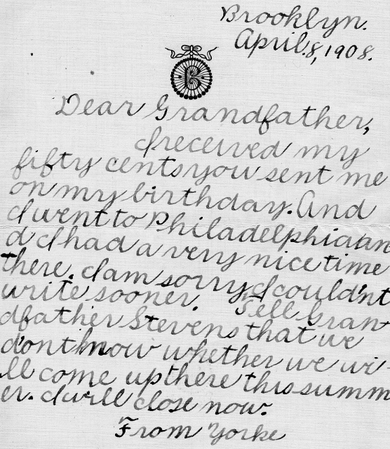 Here's a letter that Yorke wrote to his grandfather Alva Smith Blanchard in Clarendon, New York, in 1908. How about that penmanship! (Grandfather Stevens is Yorke's mother's father, John J. Stevens.)