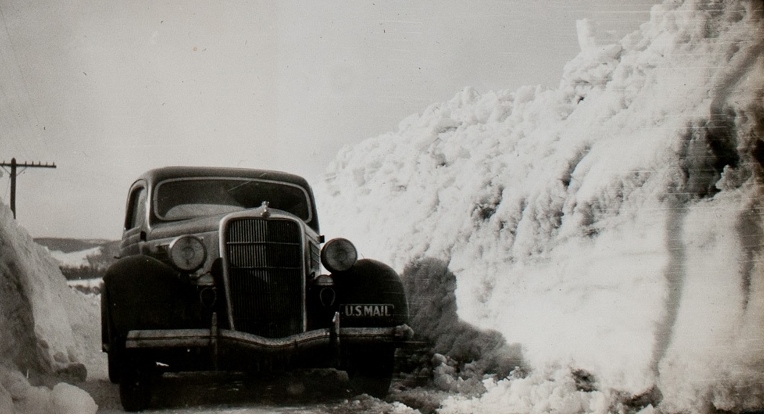 In the mornings, Yorke would park behind the post office, sort his mail and then stack it in big brown leather bags in the order of delivery – actually, in the reverse order of delivery, so the first mail to be delivered was on top. Before heading out, however, he and Ronald “Juddie” Silvernale, one of Yorke’s close friends and the fellow who had the other rural mail route in Millerton, would often stop in at Dominick’s, a bar right next door to the post office, and have a quick drink before they headed out. Yorke’s route only required him to drive about 35 miles, so, weather permitting, he would be done in the early afternoons. Sometimes in the wintertime the weather didn’t permit, however, and he would occasionally get stuck in deep snowdrifts and have to dig out and put chains on. This photo of one of his cars taken sometime in the 1930s shows how high the snow can get on the sides of the roads in Millerton.