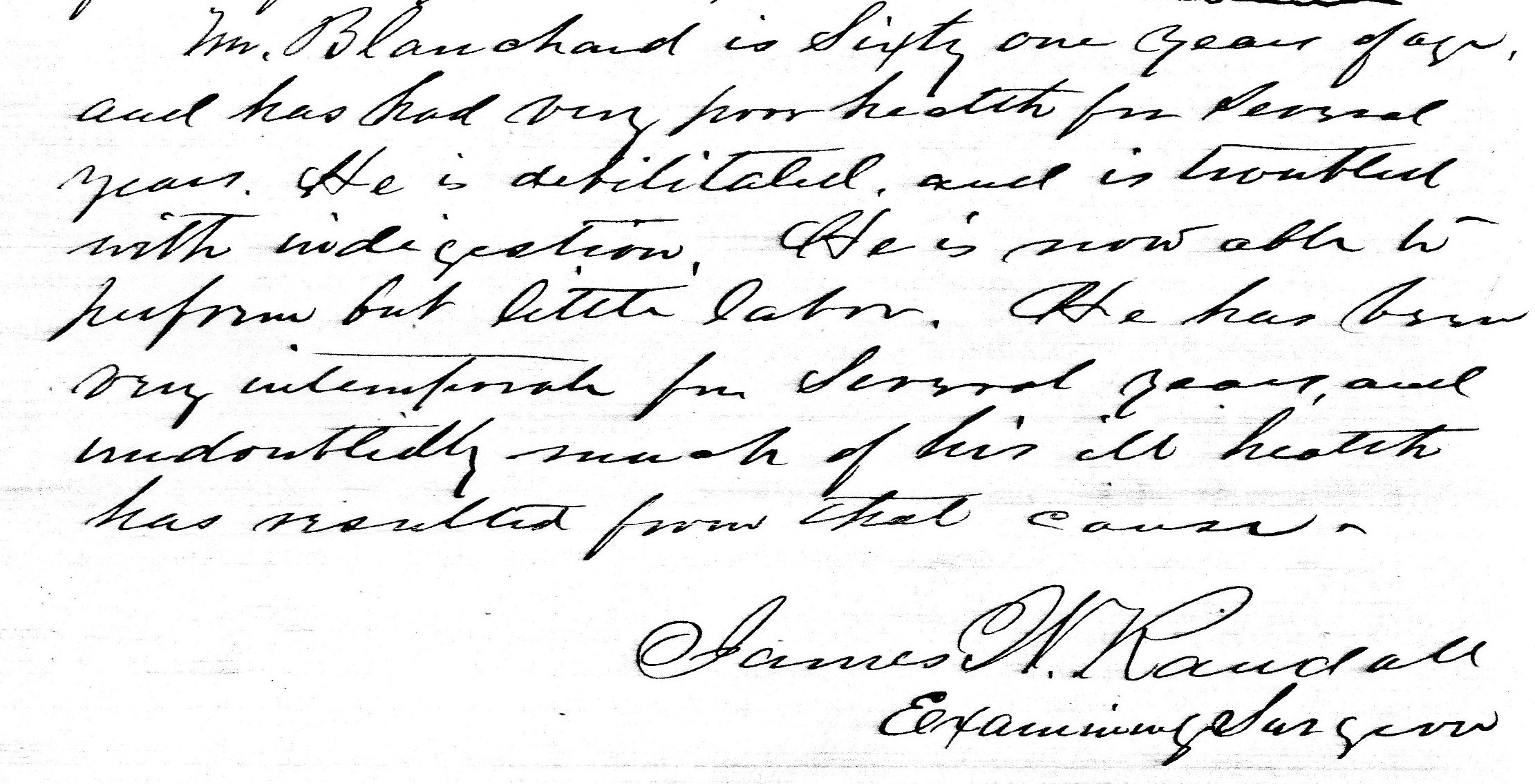 In connection with Lois’s application for a mother’s pension, a surgeon in Albion named James W. Randall examined Willard and wrote the following report dated December 11, 1865: “Mr. Blanchard is Sixty one years of age, and has had very poor health for several years. He is debilitated, and is troubled with indigestion. He is now able to perform but little labor. He has been very intemperate for several years, and undoubtedly much of his ill health had resulted from that cause.” Here's the original of Dr. Randall's report: