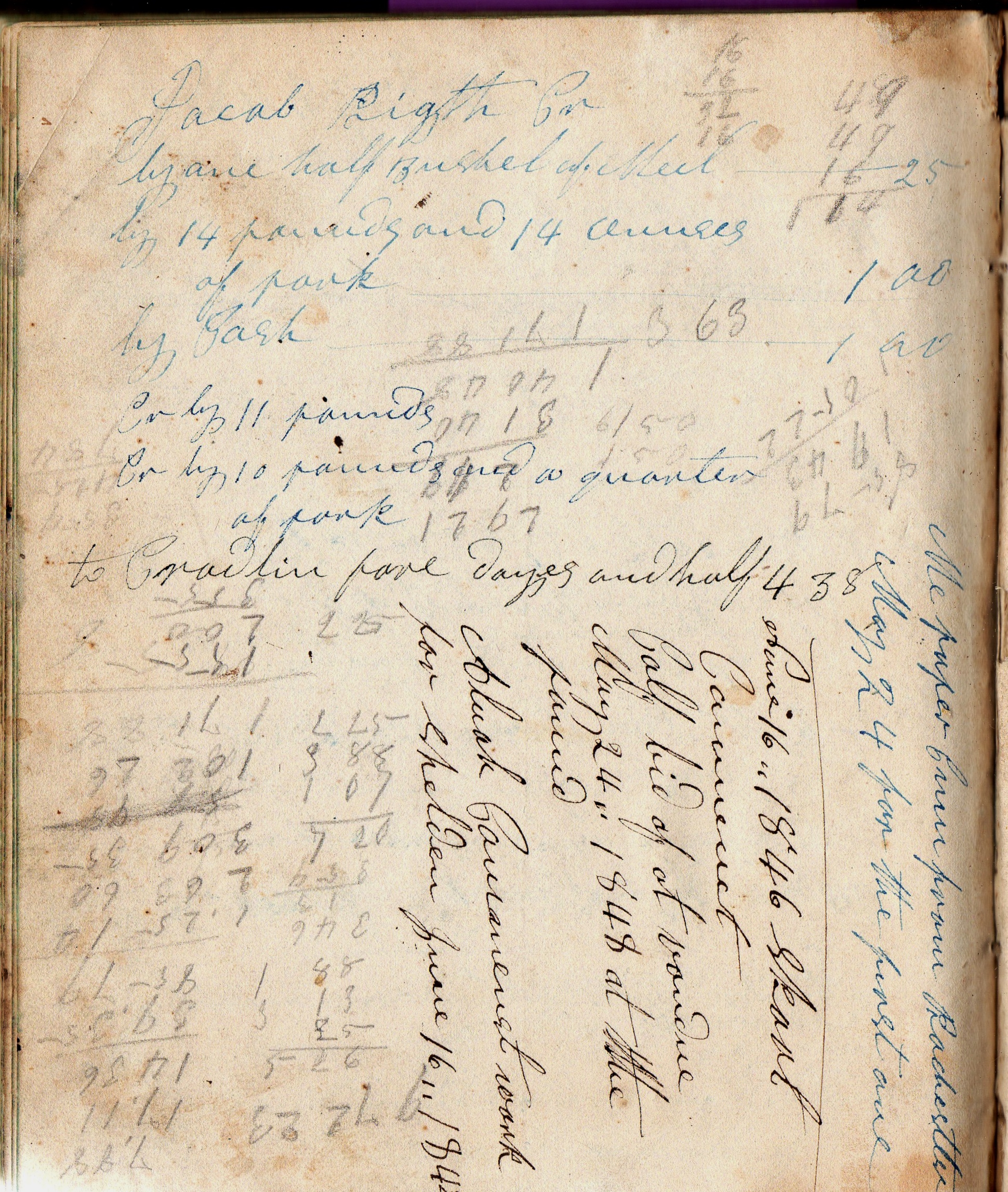 The books are really quite messy. Willard scribbled calculations and made notes wherever he could find a blank space. He made notes upside down on some pages and sideways on some pages. If there was room on the page when the first year of someone’s account had passed, he would begin another entry for the same person for the next year. Sometimes the space on that page had been filled by someone else’s account, so he would start a new page elsewhere in the book. Parts of some pages have been cut out. Some pages have been cut out entirely. He evidently wrote notes to people on these pages and simply cut them out of his ledger book. A couple of them remain in the books. There are also diary-like entries (like “Mie Cow turned to paster”) scattered among the account entries. Perhaps for services rendered he grazed his cow in one of his customer’s pastures for a few days. In the second ledger book he made notes when several of his sons started at various jobs and he noted the deaths of his parents.