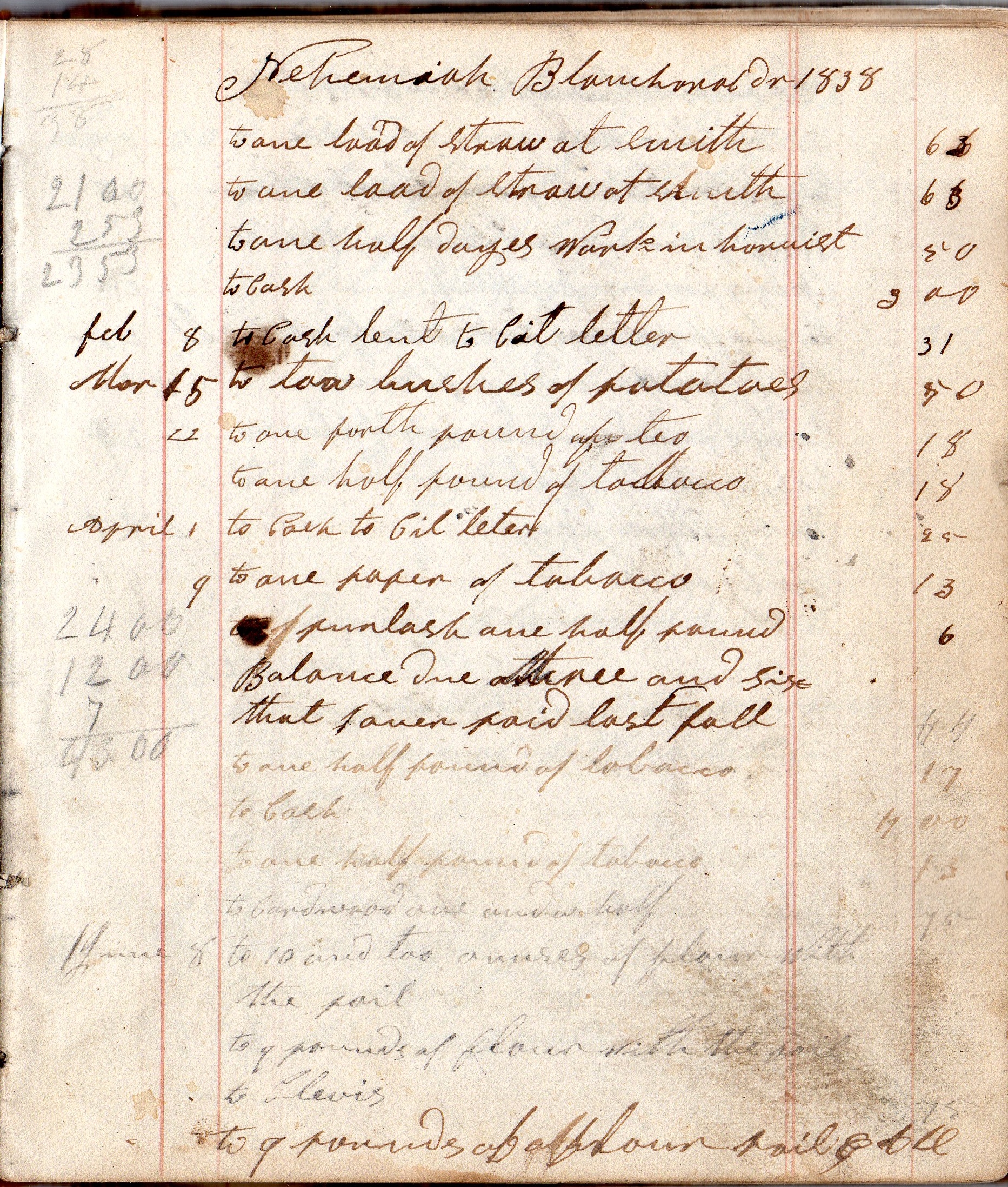 There are also pages in his book for some of his brothers and his father. Here's one for his father, Nehemiah. The entries here are for other things like potatoes, straw, tobacco and flour, not shoes. It's not clear whether these are expenses or income.