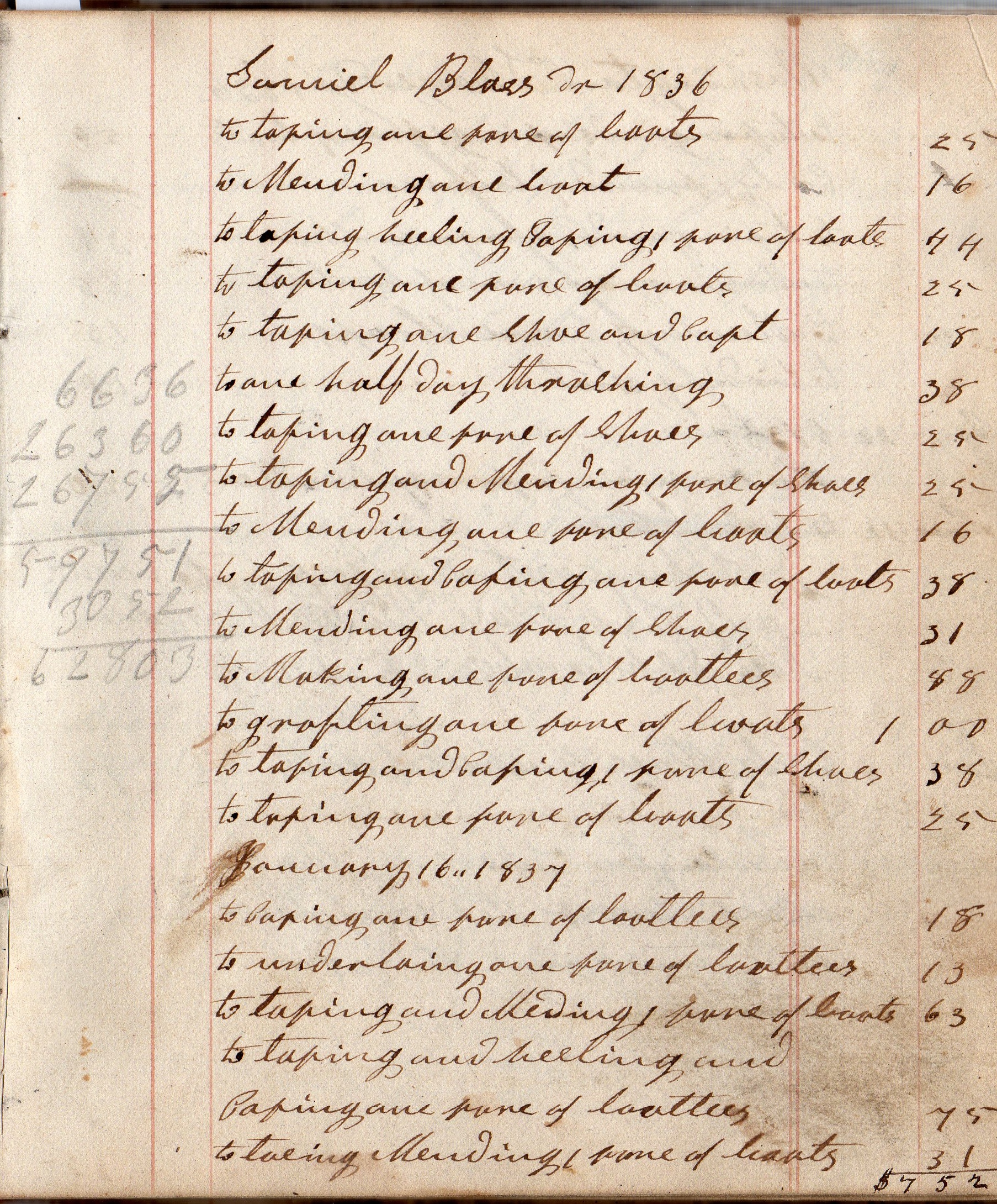 Willard made entries in these ledger books for the work he did for his customers. He made, sold, and repaired shoes, boots, boottees, kip boots, slips, and brogueans. The price that he charged to make one pair of boots ranged from 75 cents to $1.50 for lined boots and $2.50 for “fine” boots. One pair of shoes cost from 44 cents to 75 cents. One pair of boottees ranged in price from 63 cents to one dollar.